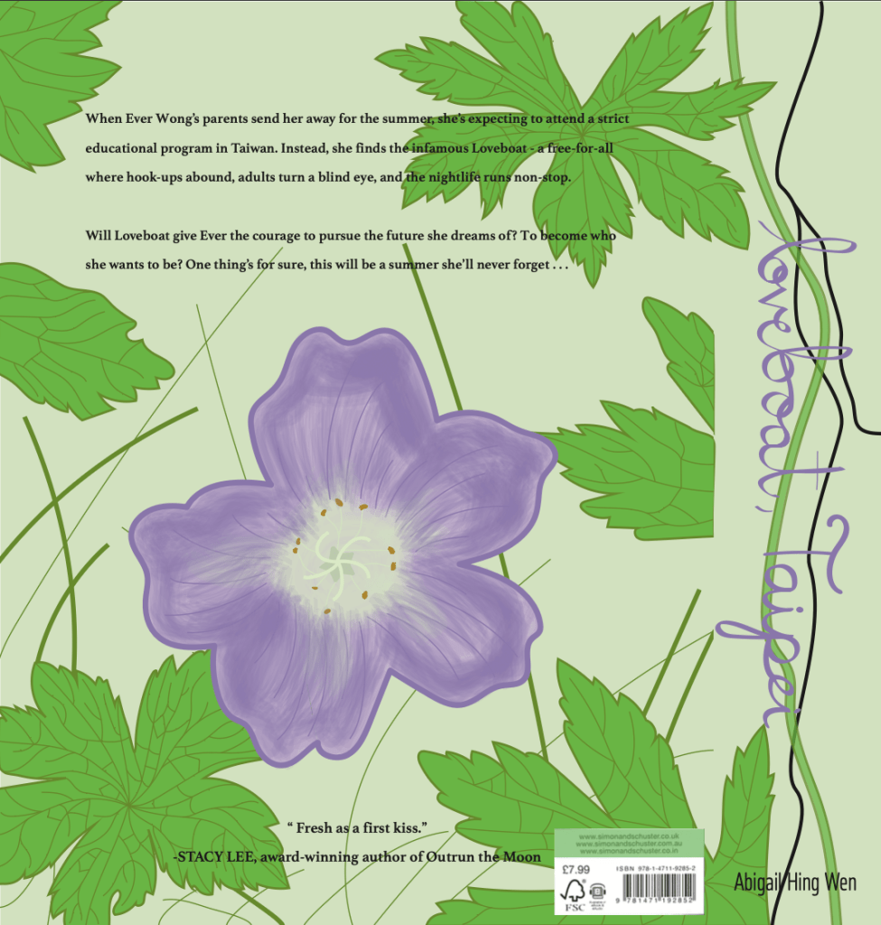 This book cover was designed based on an coming of age story line. I decided on a flower because flowers evolve just as Ever from the book. She was shy and introverted since her parents wouldn’t let her do anything but study which is why the flower is closed on the front cover. Later on in the story she started doing things she wasn’t able to do with her parents around, which is why the flower is opened and fully bloomed on the back cover. The spin is composed of both stems from the closed to fully bloomed flower.
