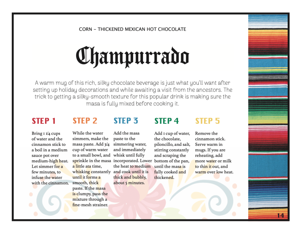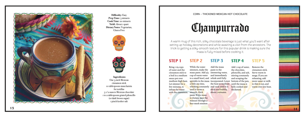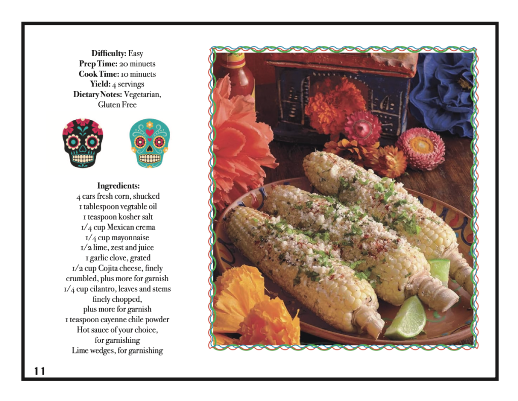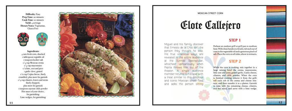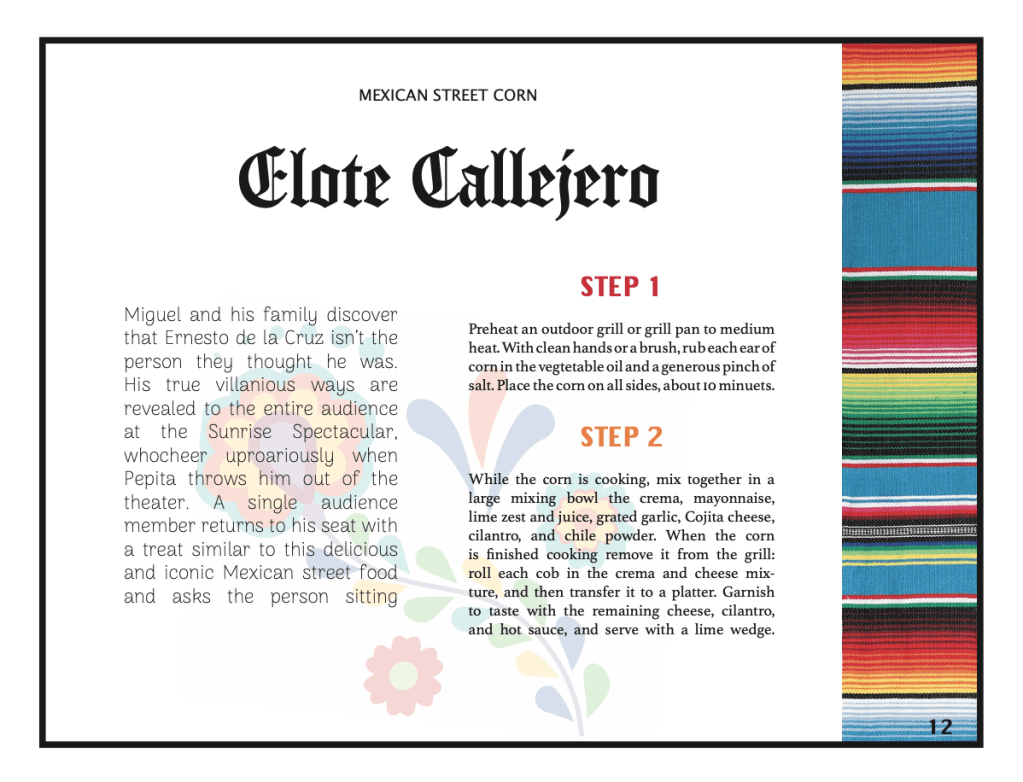 My job was to redesign a cook book that has already been publish. Since the movie Coco revolves around the hispanic culture I tried to include designs that would make you feel the hispanic culture not only when making the dish, but while you read along the pages. I included skulls, banners that they hang up during celebrations and vivid colors.