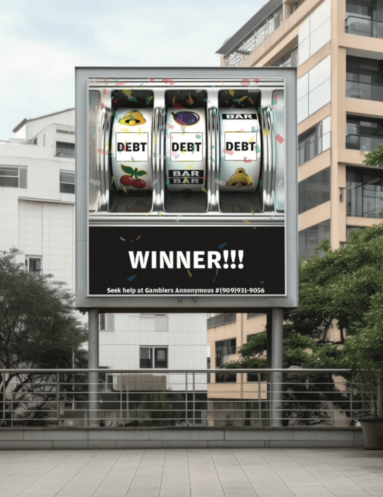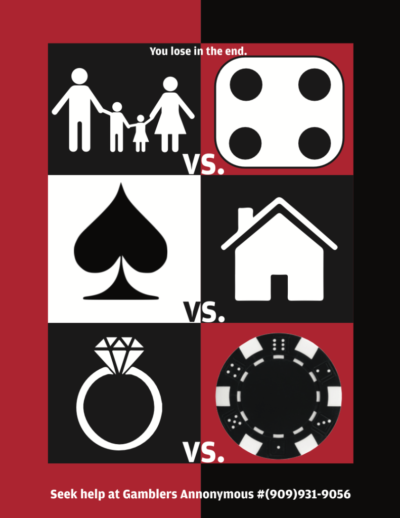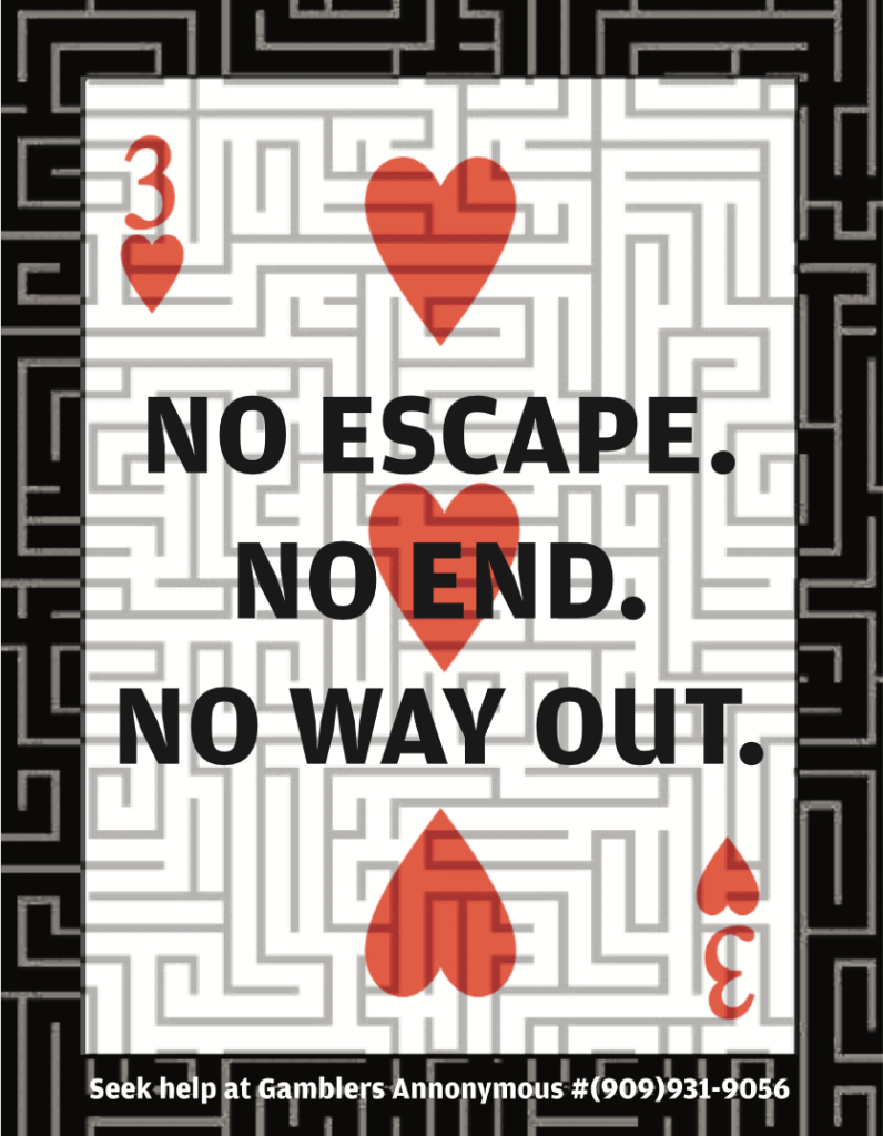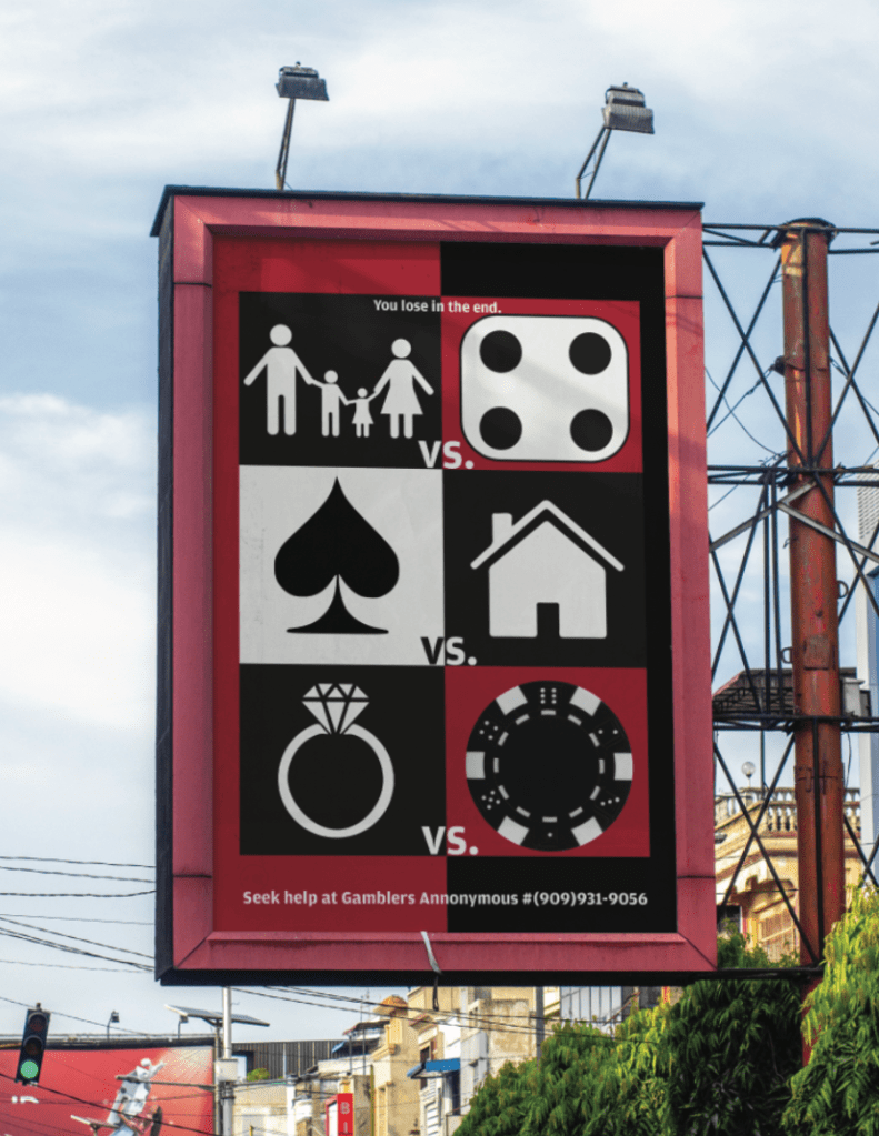 These poster designs were made to help people with gambling addiction. Most of the type font used is in bold to help persuade the viewers of how important it is to think about your choices before acting upon them.