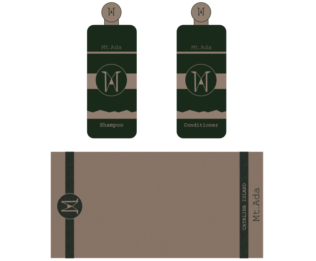 This logo I made is for a mansion on Catalina Island that they turned into a fancy hotel for tourists. The colors I chose gives off the elegancy the mansion does. The logo is composed of the letter “M” with an “A” in between which was also made to look like a mountain because the mansion is on hilltop. Along with the logo, I designed a gift bag/box, shampoo/conditioner, a towel, and a bus for transportation.