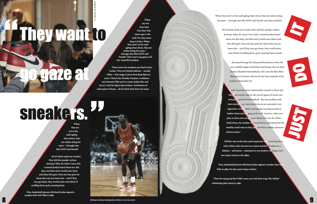 I designed magazine spreads for Jordan and Nike. My goal was to incorporate pieces that make Nike and Jordan so infamous such as Michael Jordan, Air force 1’s, sneakers, their slogan. I used bold colors and geometric shapes to tie it all together making the pages more coherent with one another.